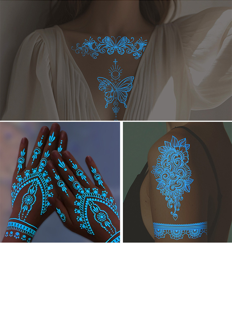 These delicate lace-style temporary tattoos glow brightly at night, creating a stunning look inspired by Indian mehndi art. Easy to apply and remove — ideal for Halloween, Christmas, festivals, or a fun night out!